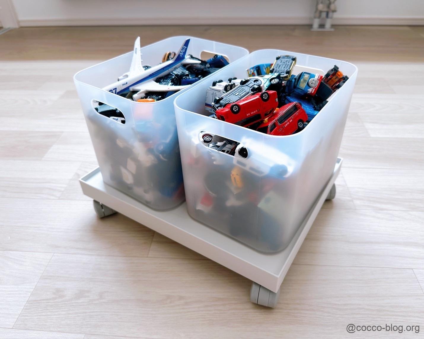 収納力も十分で、トミカをざっくり半分ずつ分けて入れるだけ。重さも半分になるので、息子がボックスだけを持ち上げて運ぶこともできました。