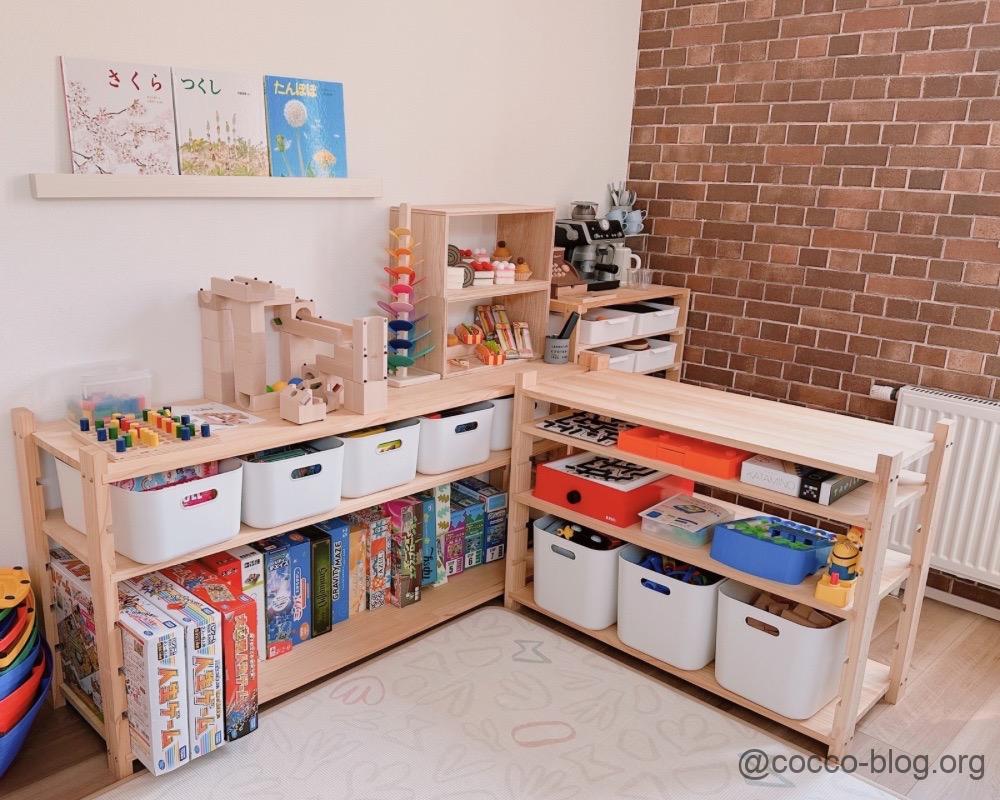 そのうえで、1階で実践していた『おままごとと他のおもちゃの両立収納』引き継ぎたいと思い、2階のスペースも工夫を重ねました。
