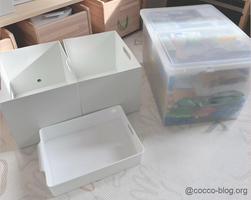 先ほどもお伝えしたように、我が家のプラレール収納は、長らくあまっていた無印のファイルボックス2つと、100均の薄型ケースでした。